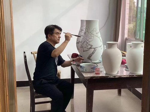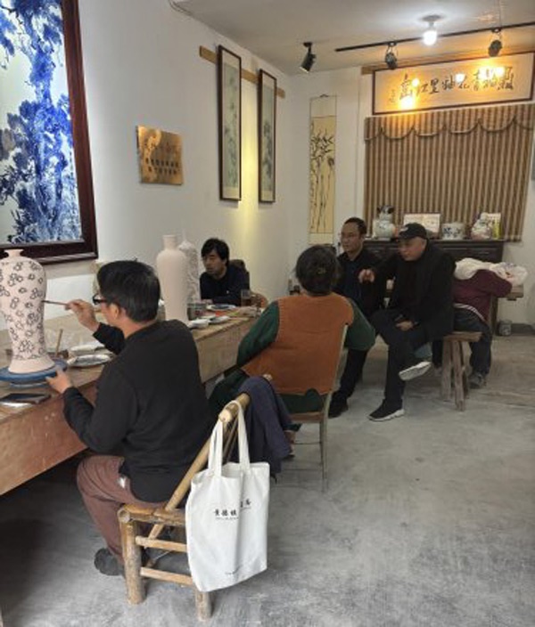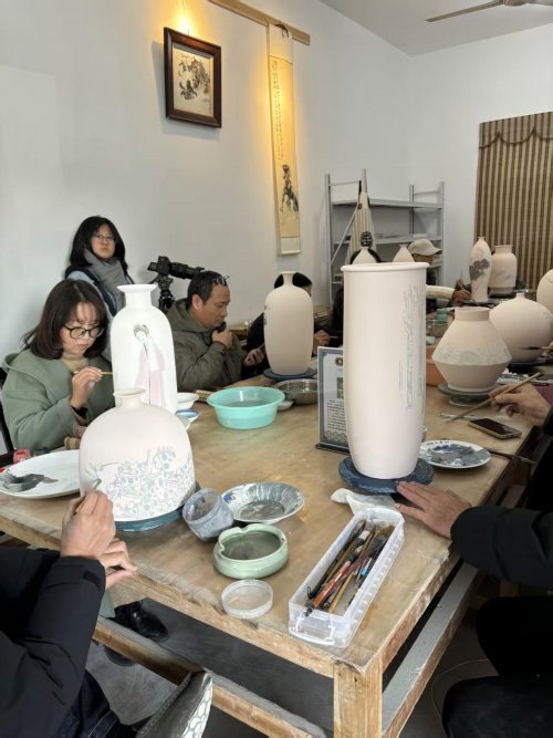 鼎福窑位于江西省景德镇市珠山区新厂街道黄泥头三步园,周围环境清静。鼎福窑的一楼大厅是师傅拉坯与修坯的地方,进门的两排木货架上陈列着师傅们做好的各式各样的手工花瓶和器皿,来画瓷的艺术家可以选择自己喜欢的造型来创作。