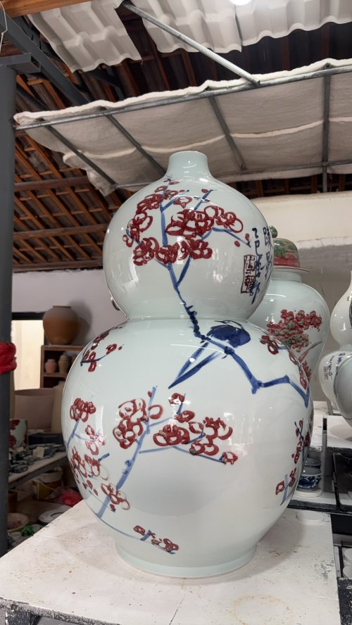 鼎福窑以烧青花釉里红最为有名,众所周知青花釉里红的烧成难度很大,烧窑师傅要能熟练地掌控窑温与火候,在青花与釉里红中找到最佳的烧成温度与气氛才可以烧出青花的清雅不俗与釉里红的浑厚艳丽,一件好的青花釉里红作品除了画的好还要烧得好。